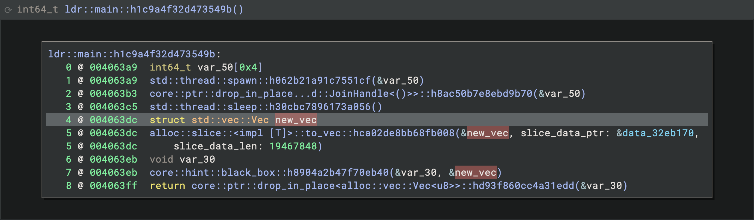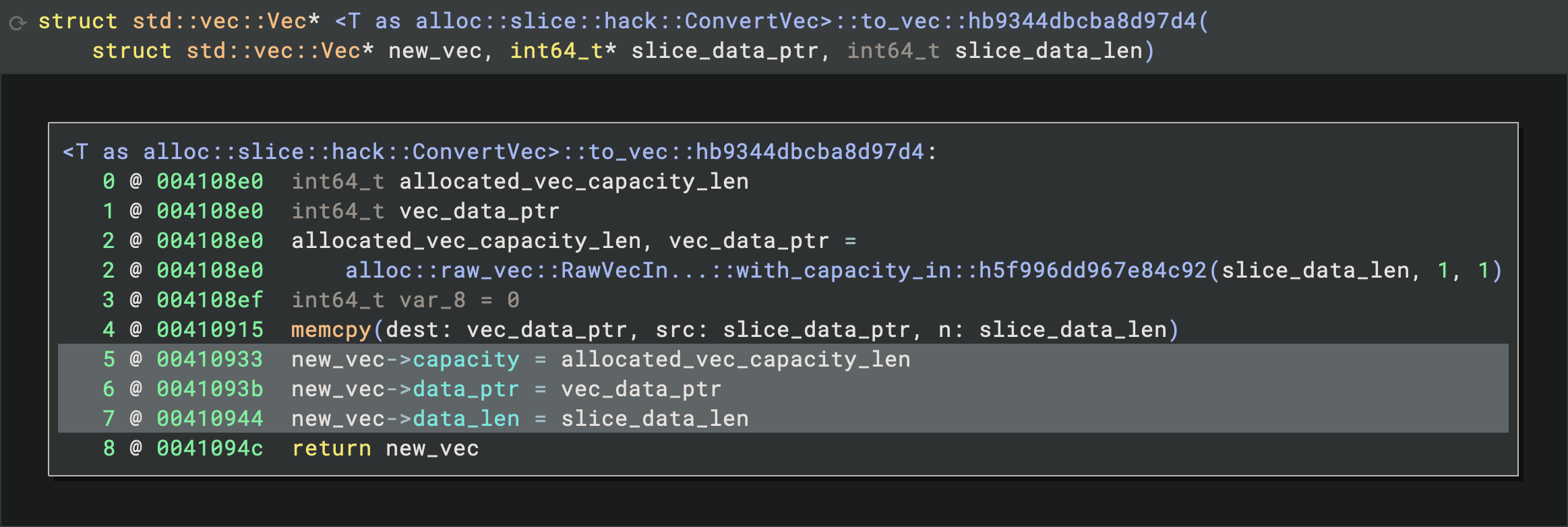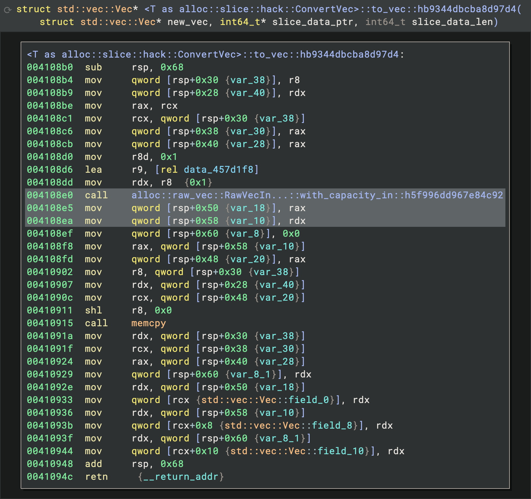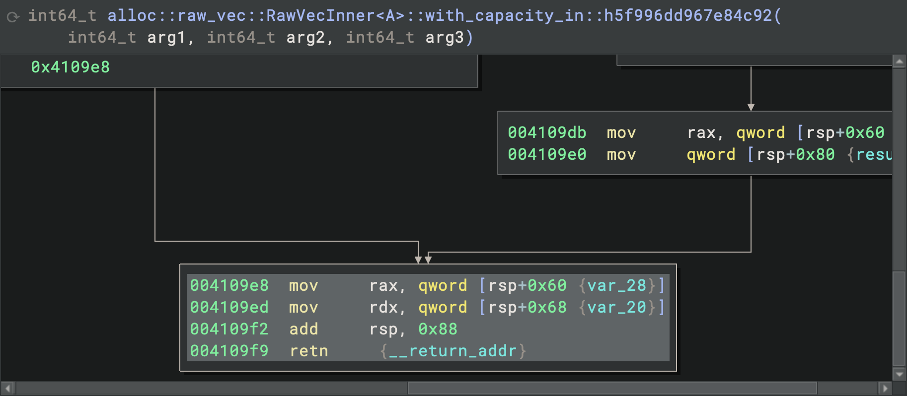 alloc::raw_vec::RawVecInner<A>::with_capacity_in, which allocates some memory that will hold the newstd::vec::Vec.- You’ll notice that the Binary Ninja decompiler has inferred that this function has multiple return values, stored in variables