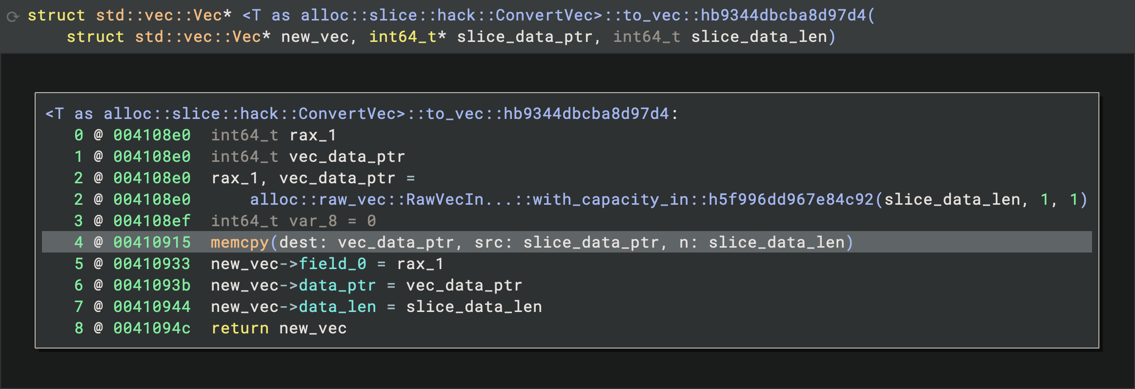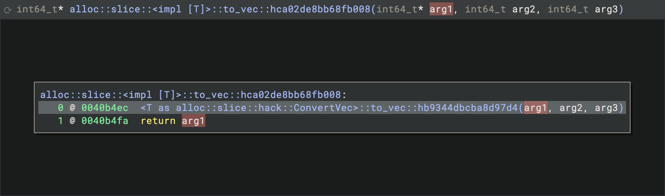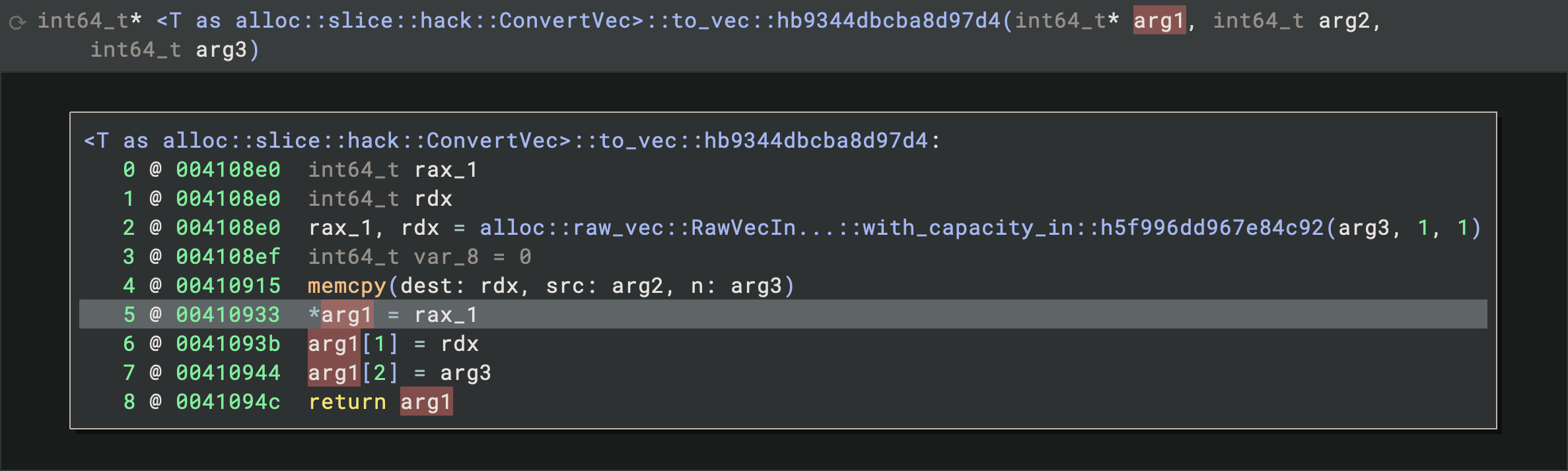 To confirm what these arguments are, we can decompile the body of the alloc::slice::<impl [T]>::to_vec function. The body of the function is very simple: it mainly just calls a second function, <T as alloc::slice::hack::ConvertVec>::to_vec, with the same arguments in the same order.
