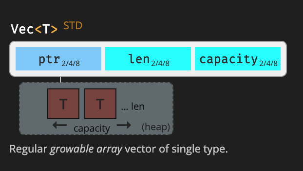 arg1is a pointer to the newly createdstd::vec::Vec.arg1[1]contains a pointer to the data inside the newly createdstd::vec::Vec.arg1[2]contains the length of the original slice of data; it is also the length of the data inside the newly createdstd::vec::Vec.- It’s unclear what the purpose of