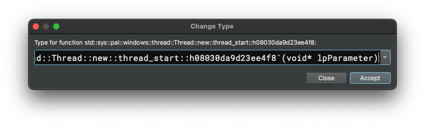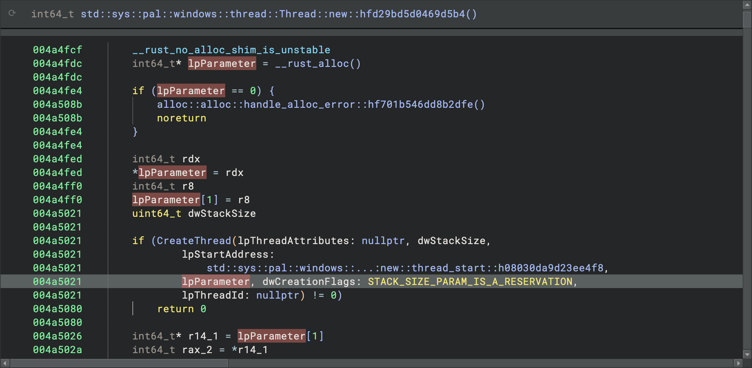We can set lpParameterto this trait object type. We also observed above that lpParameter’s fields came from some additional registers (rdx, r8), which were likely arguments to the std::sys::pal::windows::thread::Thread::new function. Let’s mark up the decompilation, to add those two new arguments to the calling function, and to retype the lpParameter variable: