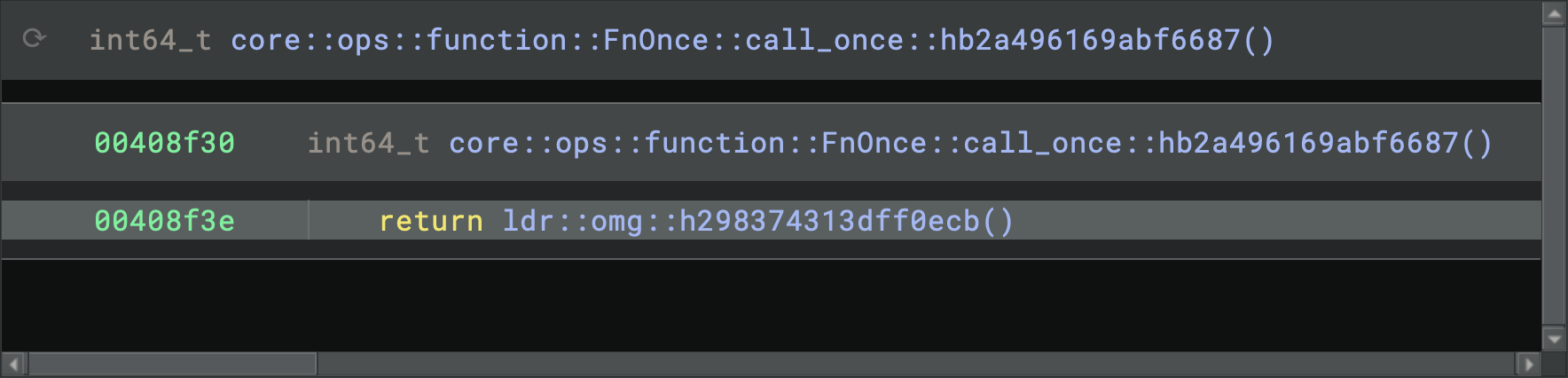 This is a closure type! As discussed above, this is a type which represents a function. We can make a very good educated guess as to which function this represents and eventually calls - it’s ldr::omg, right in the name of the type.