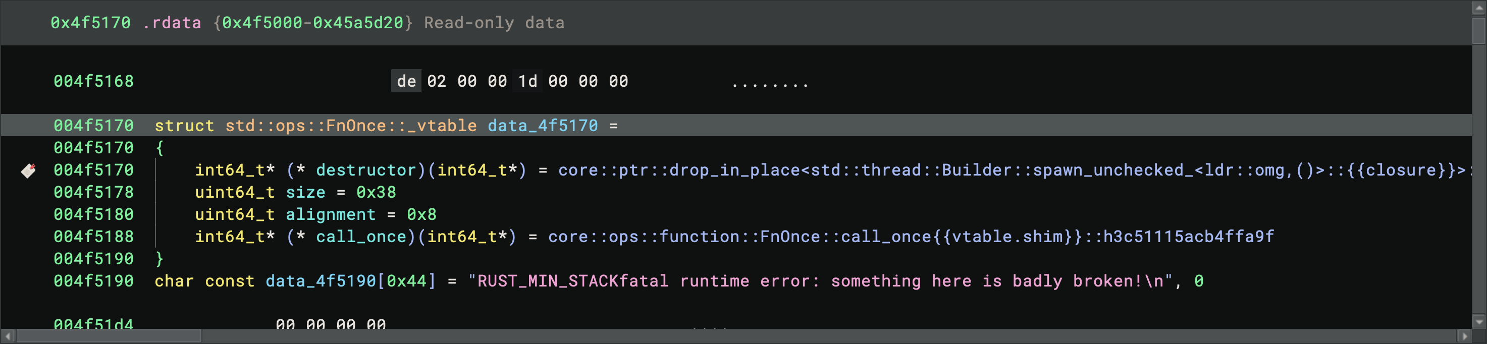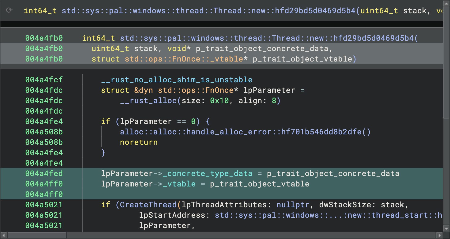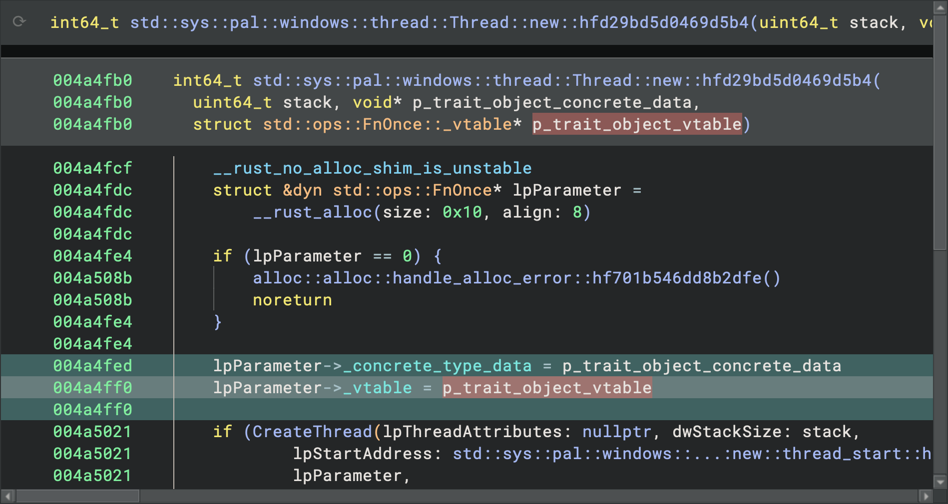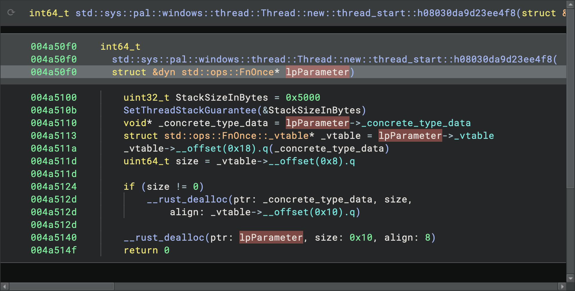 We can find this vtable inside the binary. Recall that above, using our newly typed lpParameter argument, we marked up the std::sys::pal::windows::thread::Thread::new function in the decompiler, with a function signature that looked like this: