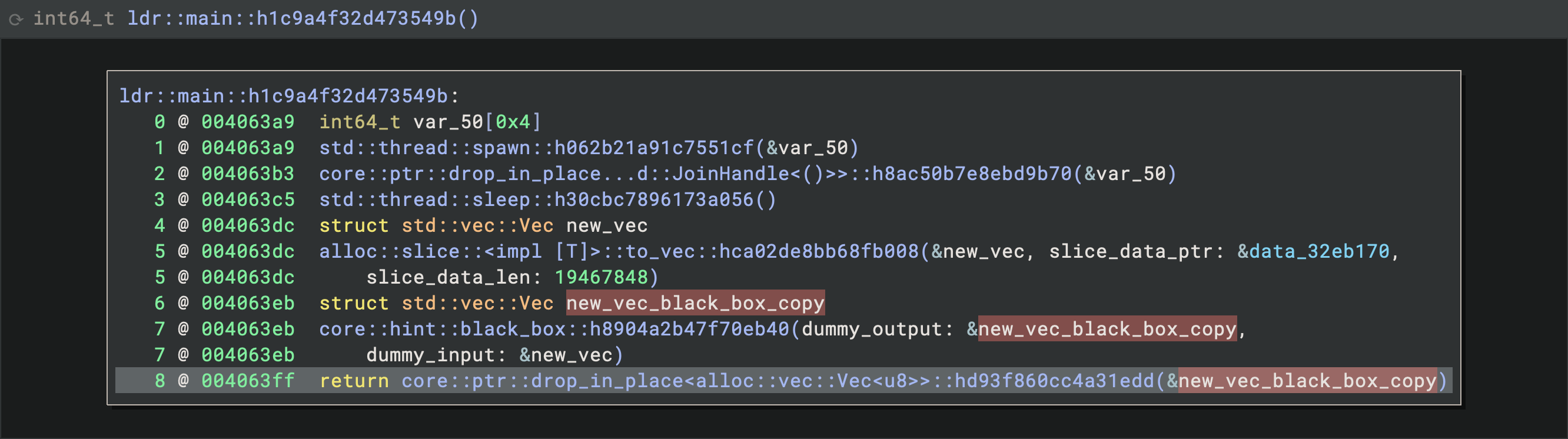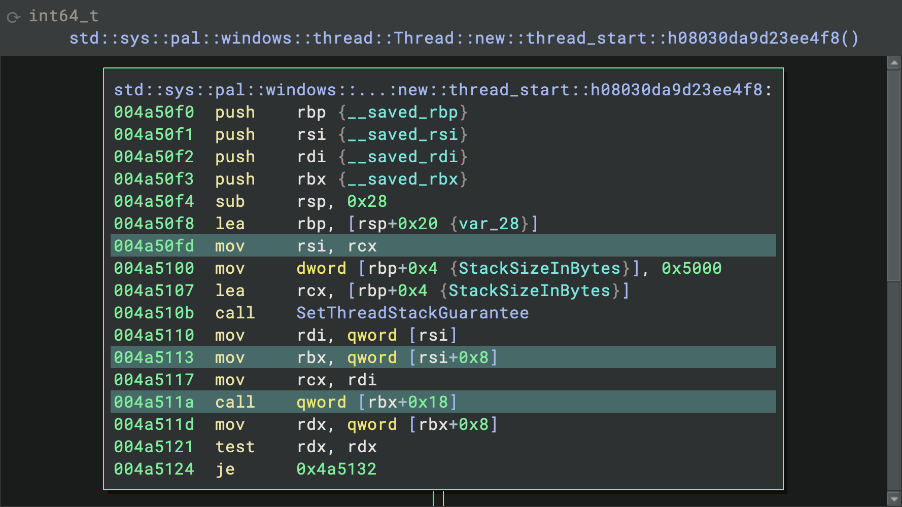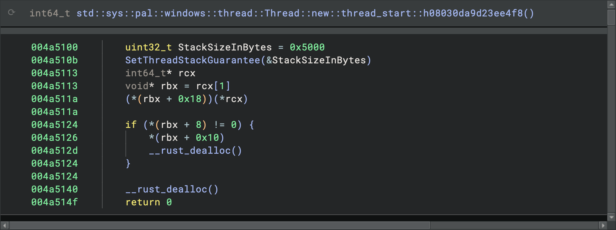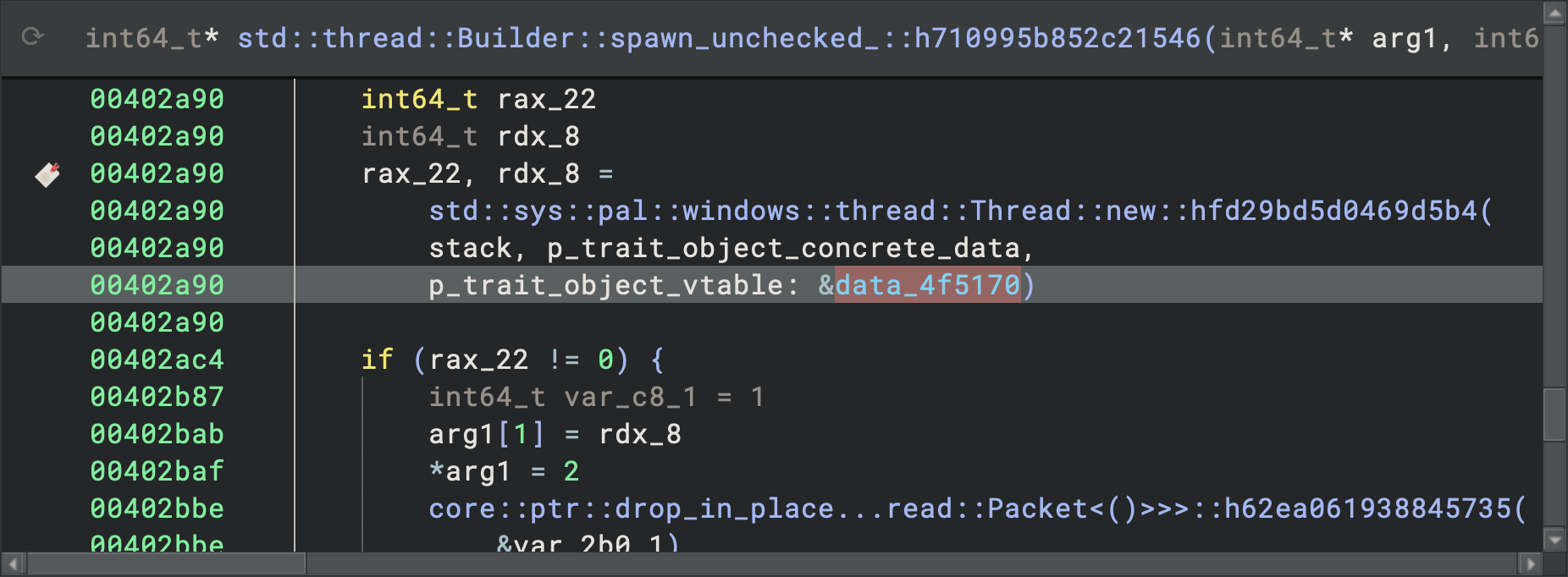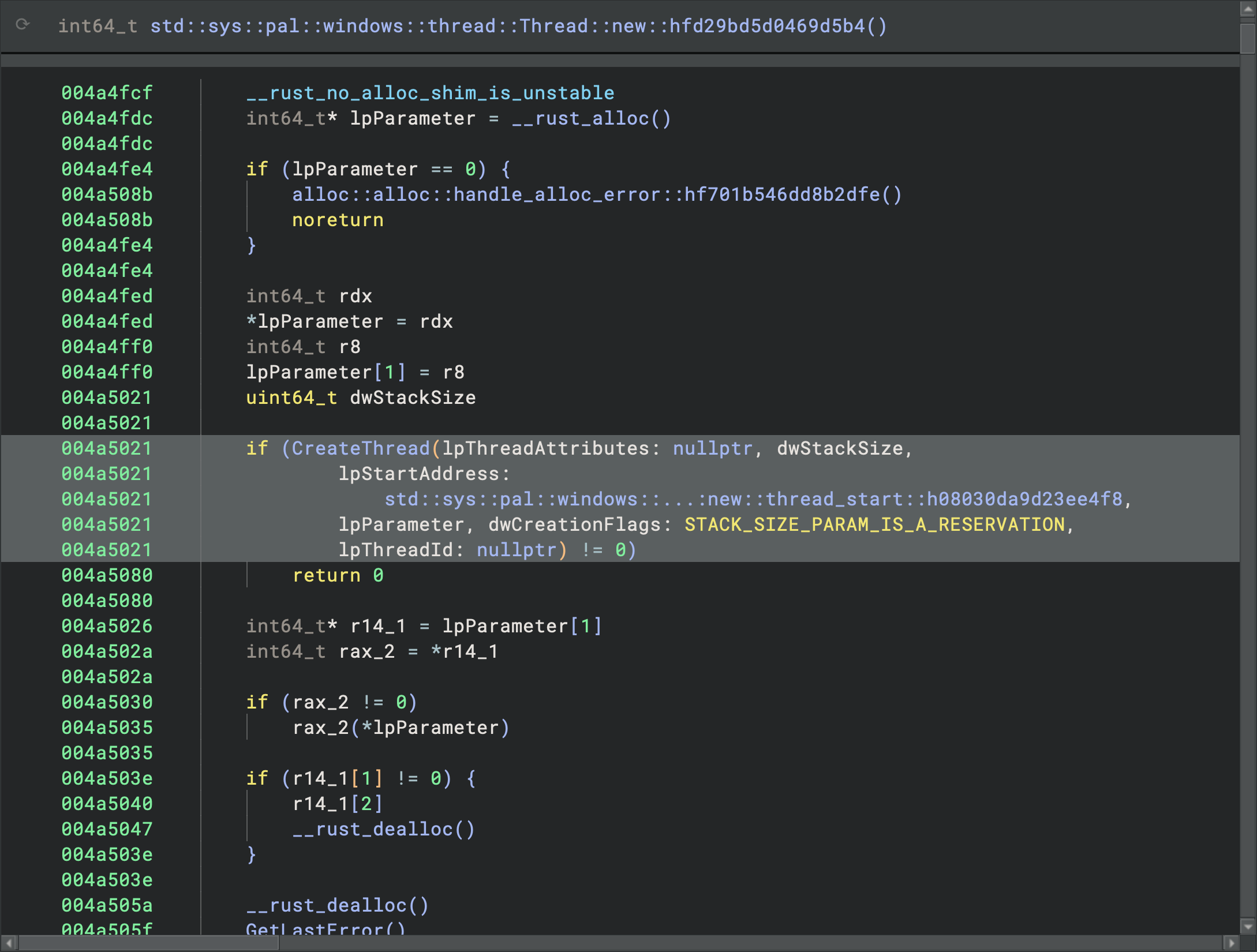 We can find this vtable inside the binary. Recall that above, using our newly typed lpParameter argument, we marked up the std::sys::pal::windows::thread::Thread::new function in the decompiler, with a function signature that looked like this: