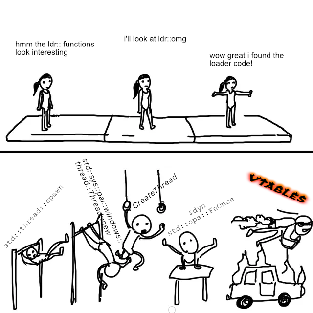 This was a lot of indirection, learning about Rust language concepts, and frustrating reversing. In this case, this binary did have symbols, so we actually could have made an educated guess at the very beginning that ldr::omg was important, and immediately started analyzing it. It feels a little bit like this meme: