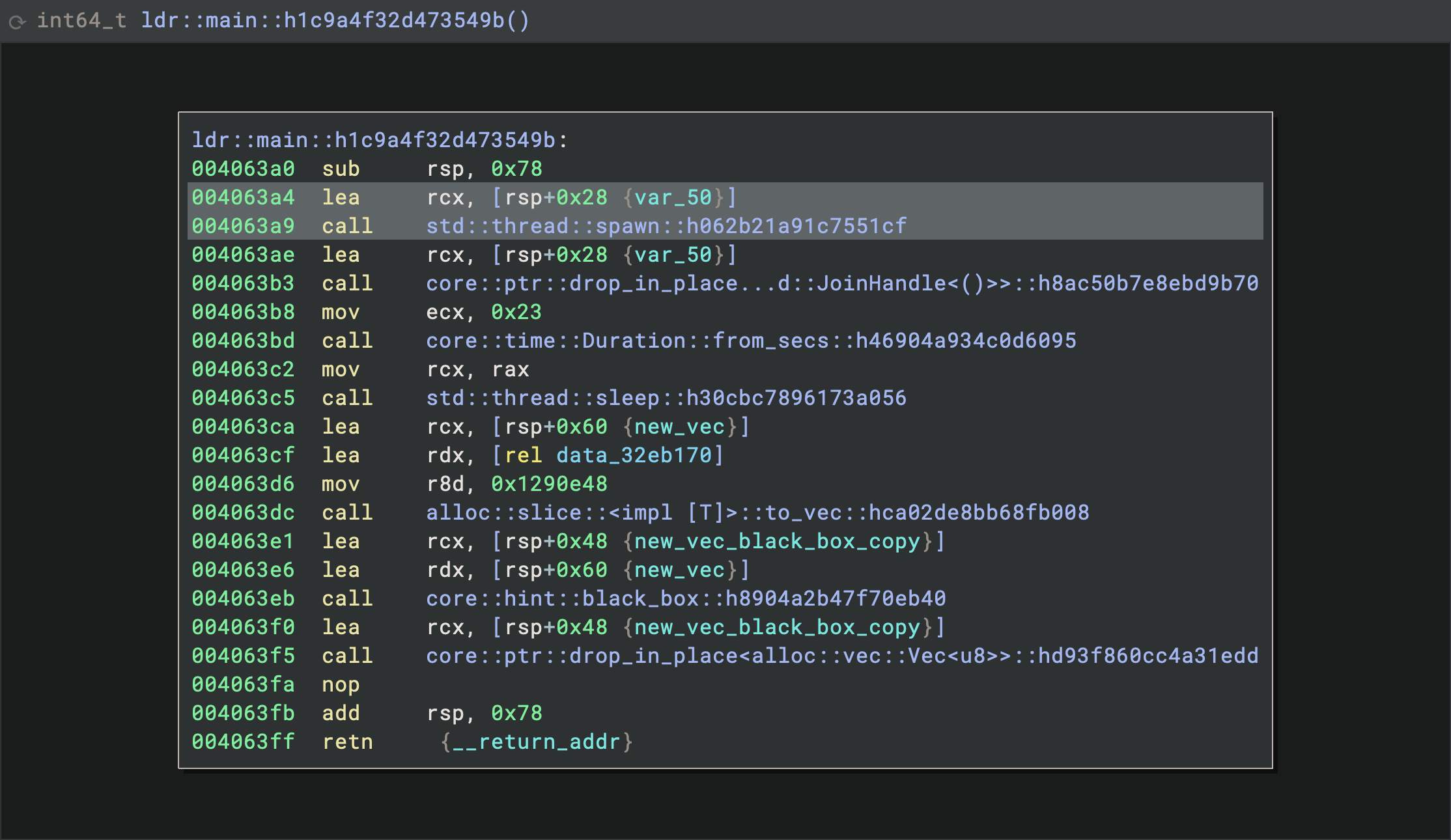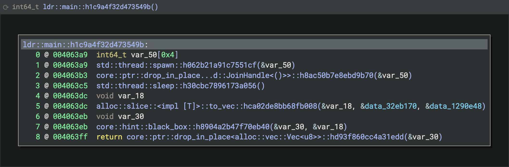 I’ll go into detail about the techniques used for reversing this sample, which are useful for reversing other Rust binaries too. Even though the operation of the loader itself is fairly simple, reversing it is a good exercise for learning about how threads, dynamic dispatch, and types work in Rust binaries. The loader sample also has a few tricks for slowing down static analysis; they’re simple anti-analysis tricks, but they can appear extra intimidating and confusing when the binary is written in Rust.