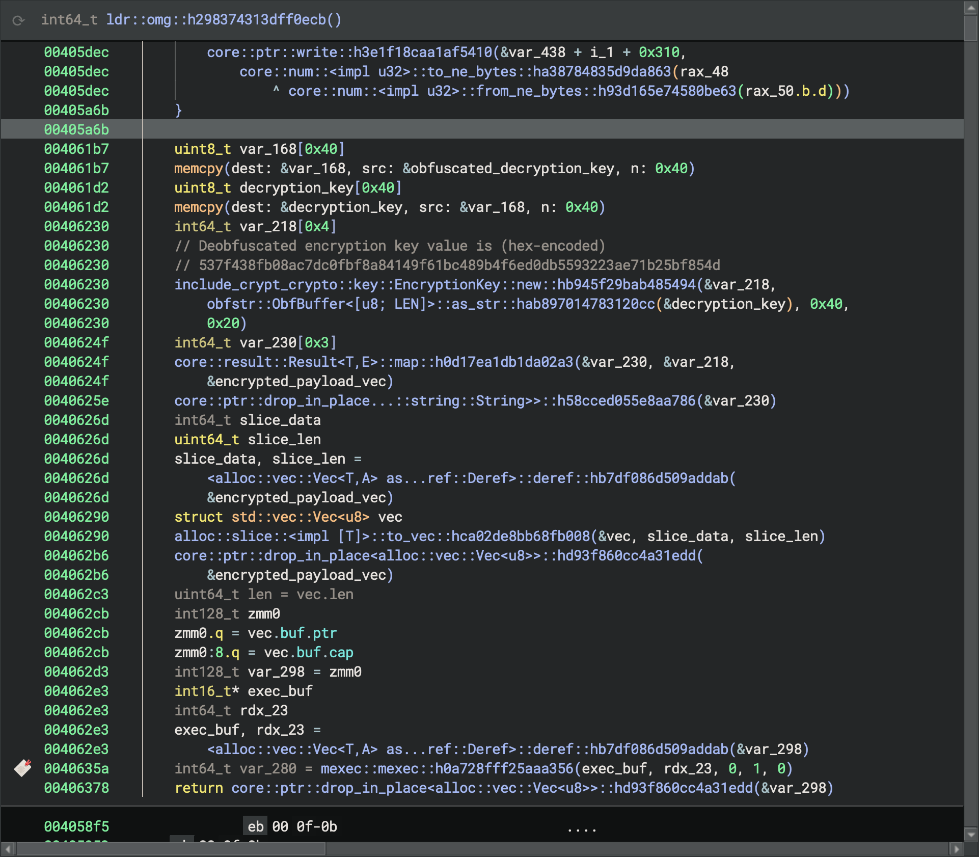 Finally, we’ve reached ldr::omg, the main payload decryption function. It contains: