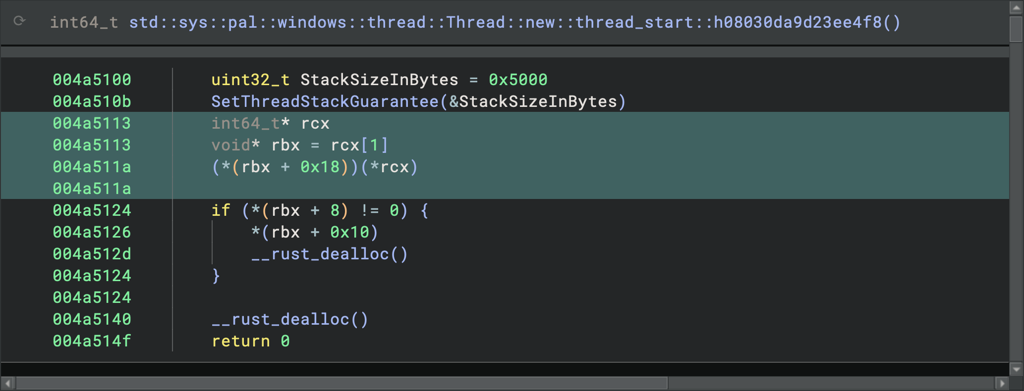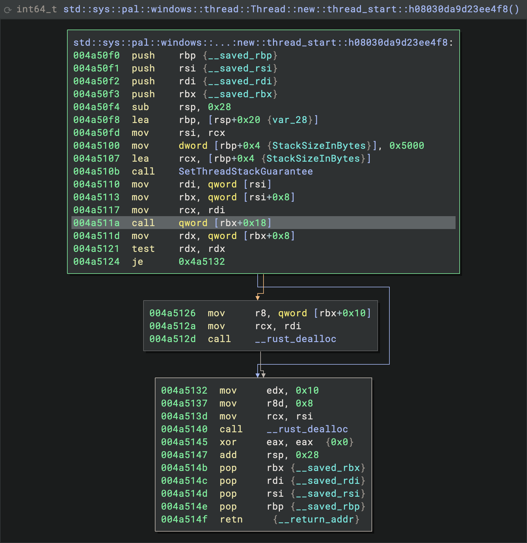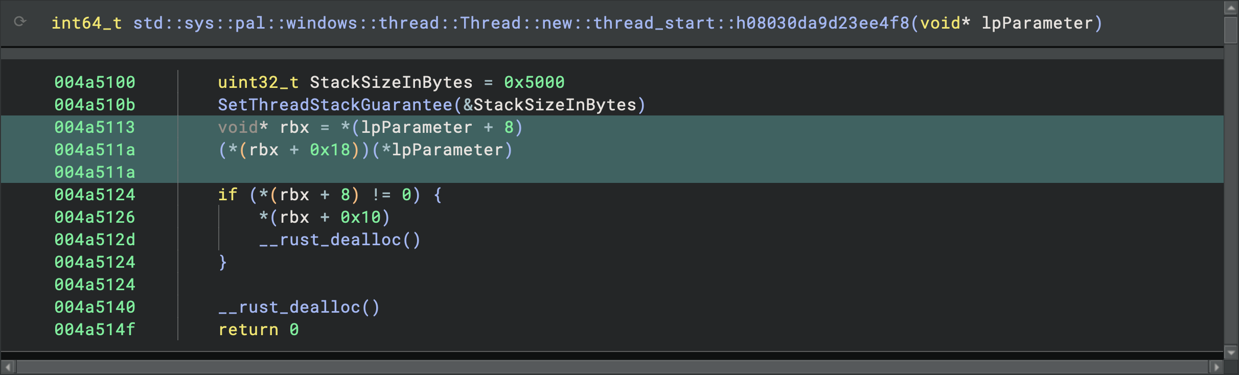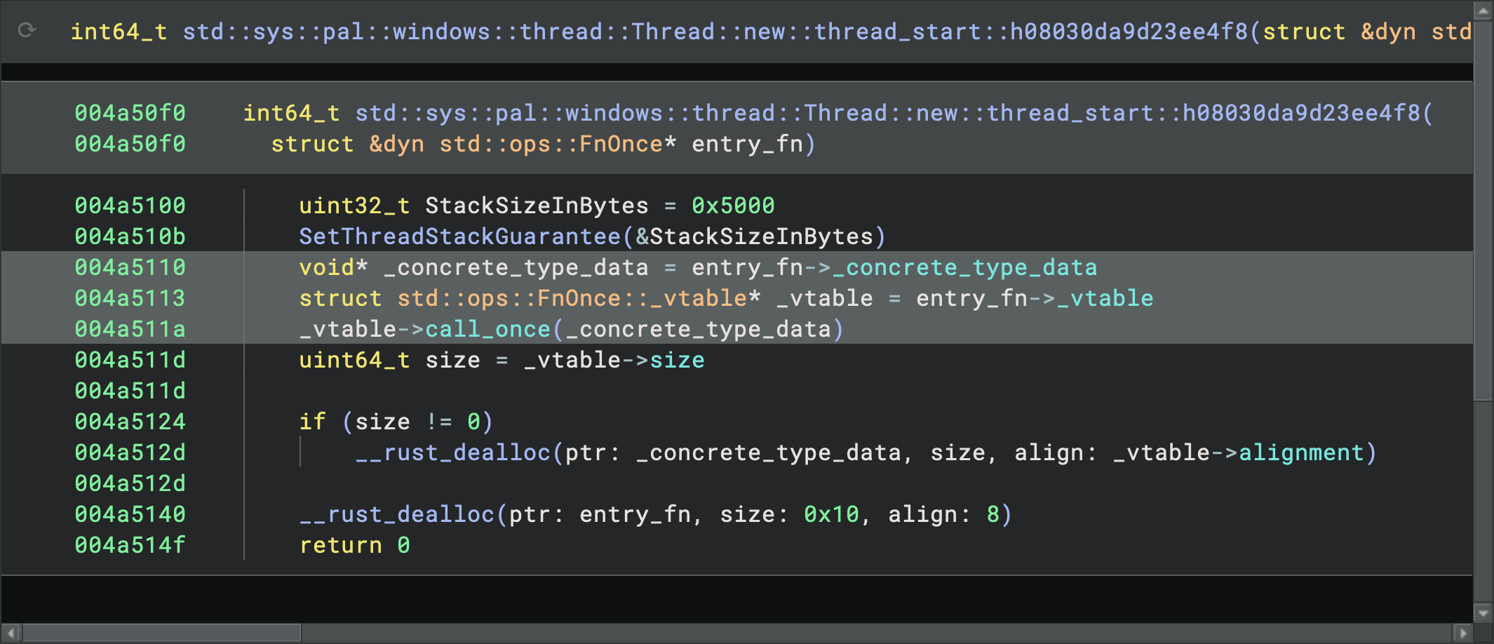 Recall the indirect function call that we noted before in this function, at address 0x4a511a. Here, we can see something interesting - that indirect function call actually comes from the _vtable field of the lpParameter argument! As we’ll see, this is actually a call to the call_once trait method on the &dyn std::ops::FnOnce trait object.