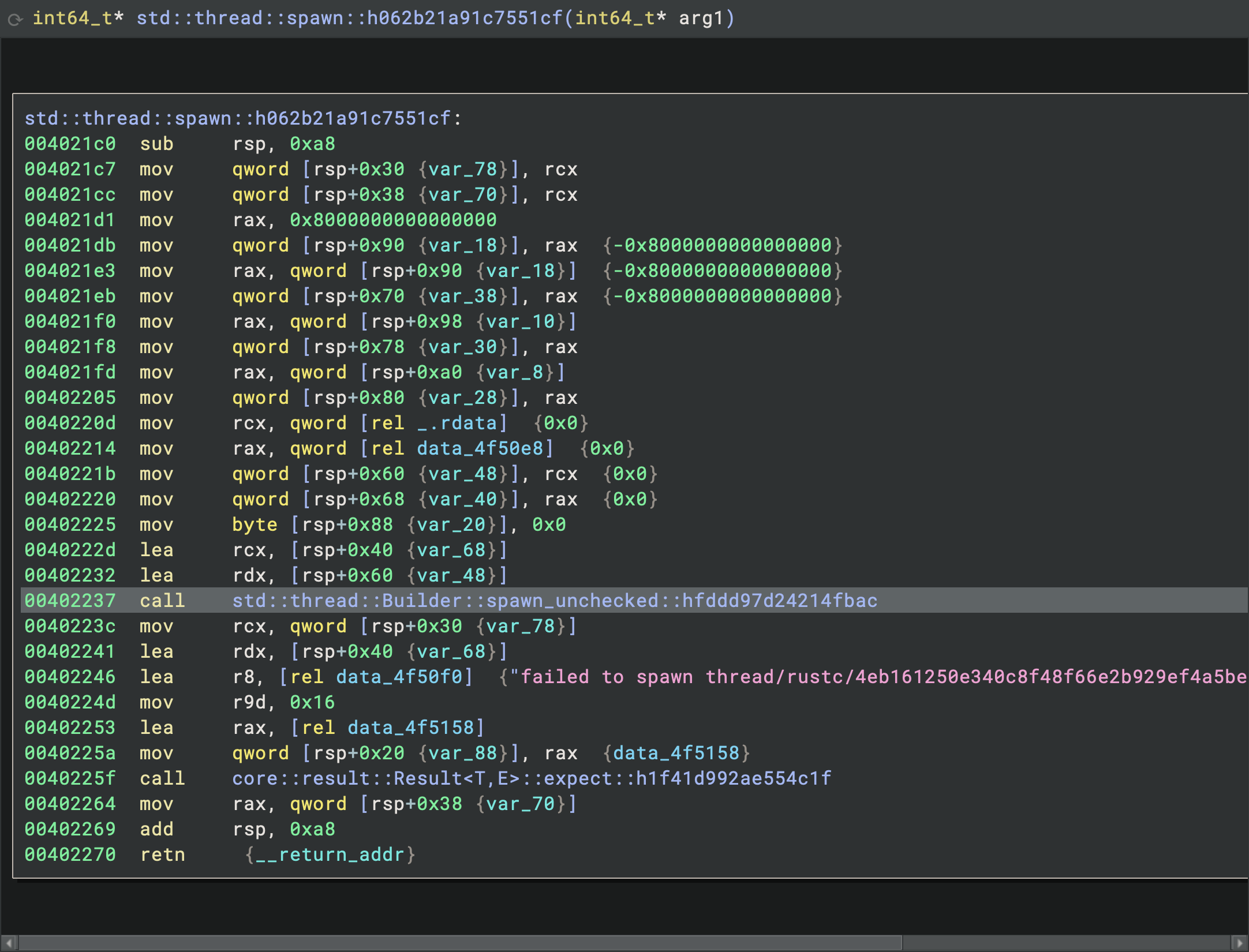 std::thread::spawn. However, it’s not clear where the entry point to the new thread is. - There is a call to