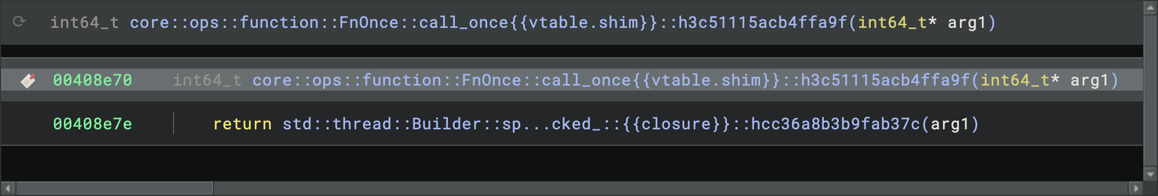 Now that we’ve set the type for the _vtable field in the FnOnce trait object, we can finally see what that indirect call at 0x4a511a is doing. It’s an invocation of the call_once trait method of FnOnce!