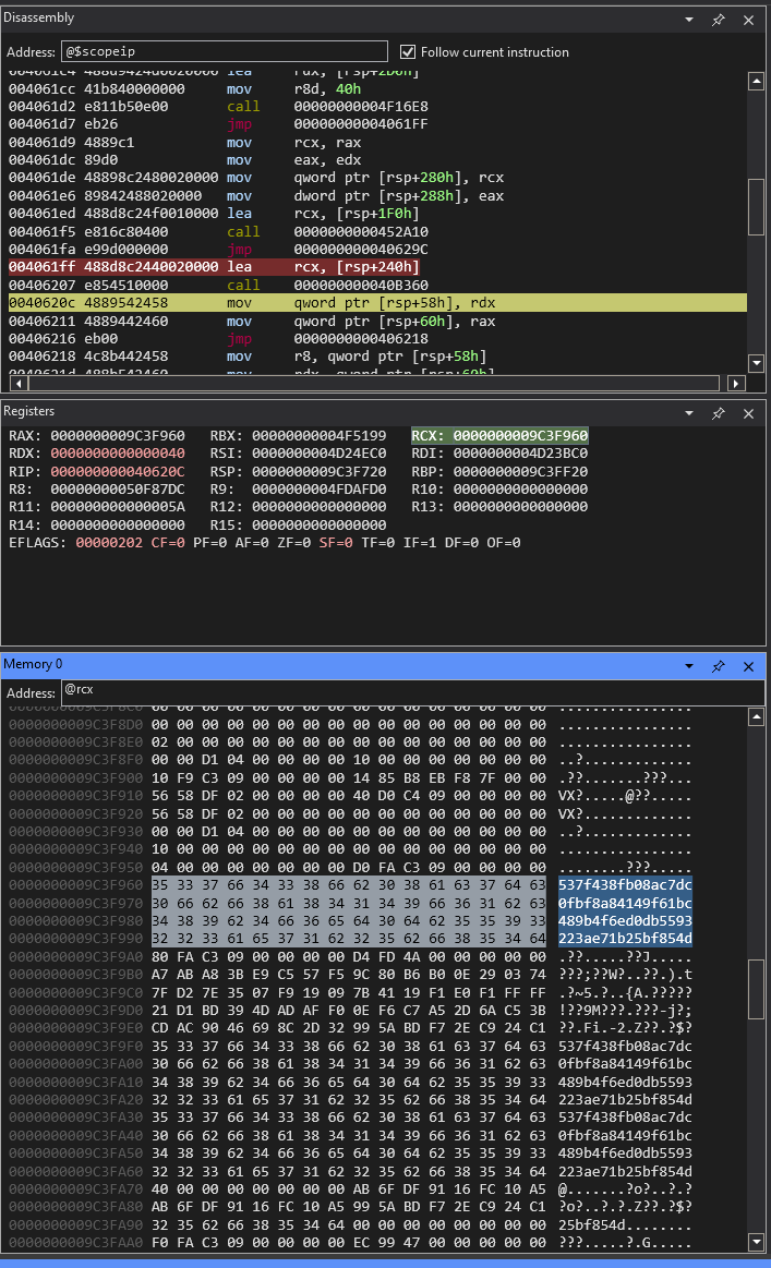 For this one sample, it was easiest to obtain the XOR key by debugging the binary. Here, I set a breakpoint on virtual address 0x4061ff, which is the instruction that passes the deobfuscated XOR key value into obfstr::ObfBuffer<[u8; LEN]>::as_str, via register rcx: